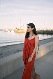 The “GENTLE FLUIDITY” maxi dress is made of 100% viscose fabric. The length of the straps is adjustable, and they tie on the shoulders while the pleating on the bust creates fluid draping. Its loose shape covers the body gently and the shoulder straps can be tied around the waist while the shiny fabric makes it perfect for evening looks.