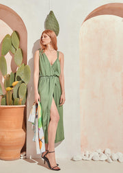 Made from luxurious silk, this wrap ankle finish dress has a wrap neckline front and a two-strap one side back that can be adjusted to your body. The elastic inner belt makes it fitted on the waist with gathered fabric and a front dramatic slit. The silk fabric has a very smooth and soft touch as a special outfit and is perfectly suited for weddings and occasions. It is lined with inner fabric.